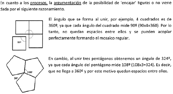La resolución en este caso se hizo correctamente, a diferencia de lo que sucedió en la tarea 1 (que era individual). El análisis de la actividad matemática también mejoró con respecto al análisis individual realizado en la tarea 4. Se observó también una diferencia respecto a la valoración de los problemas con referencia a la valoración individual realizada en la tarea 3. El hecho de haber introducido en la tarea 4 el análisis de la actividad matemática, y el hecho de que el trabajo era en grupo, propició que la mayoría de los grupos justificasen el cumplimiento de los criterios de un buen problema (Tabla 3) con evidencias extraídas del análisis (realizado anteriormente) de la actividad matemática. Un ejemplo sería el caso del siguiente grupo. Este grupo propuso un problema sobre mosaicos regulares con el objetivo de que los alumnos descubriesen que no se pueden formar mosaicos regulares con pentágonos regulares. El análisis de la actividad matemática que hicieron contempló diferentes aspectos; con relación a los contenidos fue el siguiente:
