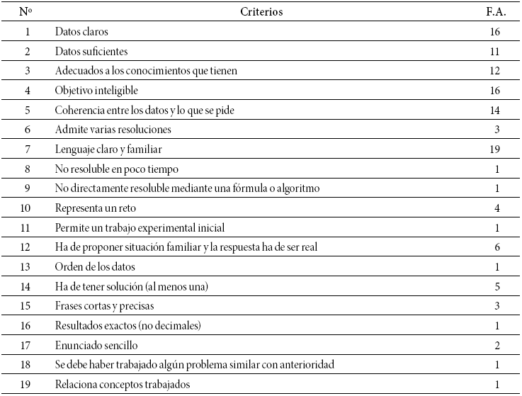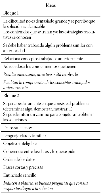 Estos criterios se incorporaron a los bloques de la Tabla 2, con lo que se obtuvo un nuevo listado de características de un buen problema (Tabla 3).