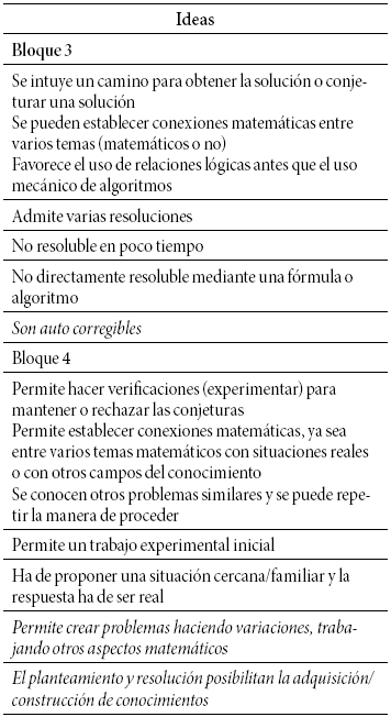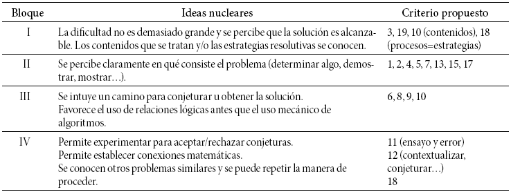 A continuación los criterios 14 y 16 se eliminaron después de que el profesor argumentase que no eran válidos. Un problema no debe necesariamente tener solución y, en muchos casos, la solución no es exacta. Por último, el profesor les hizo observar (Tabla 2) que los otros criterios se podían agrupar en cuatro bloques: a) el bloque I tiene que ver con que el que resuelve el problema tenga los conocimientos matemáticos necesarios para poder hacerlo, así como el conocimiento sobre algunas estrategias generales de resolución de problemas, de manera que el problema no le presente una dificultad insalvable; b) el bloque II consta de las ideas relativas a la estructura de los enunciados (información y requerimiento); c) el bloque III se relaciona con la distinción entre ejercicio y problema; d) el bloque IV se relaciona con procesos matemáticos implicados en la resolución del problema.