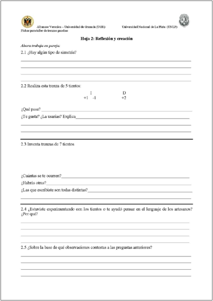 En este sentido, uno de los etnomodelos que proceden de la investigación previa (Albanese y Perales, 2014) proporciona un sistema simbólico que sigue la lógica propia de los artesanos para la práctica de trenzar. El taller se centra en presentar y trabajar con este nuevo sistema para tratar de sacar a la luz su lógica y el porqué de la misma.