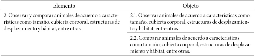 Dado que un elemento puede estar integrado por más de una habilidad y un contenido, y con el fin identificar unívocamente estos componentes, los elementos fueron segmentados, a su vez, en objetos. Así, los objetos constituyen la unidad mínima informativa verbal y/o visual asociada a un único contenido y a una única habilidad declarados en las Bases Curriculares 2012 en un determinado nivel educativo (Meneses et al., 2014). En el Cuadro 1 se representa la relación entre elementos y objetos en dos objetivos de aprendizaje de 1° de primaria.