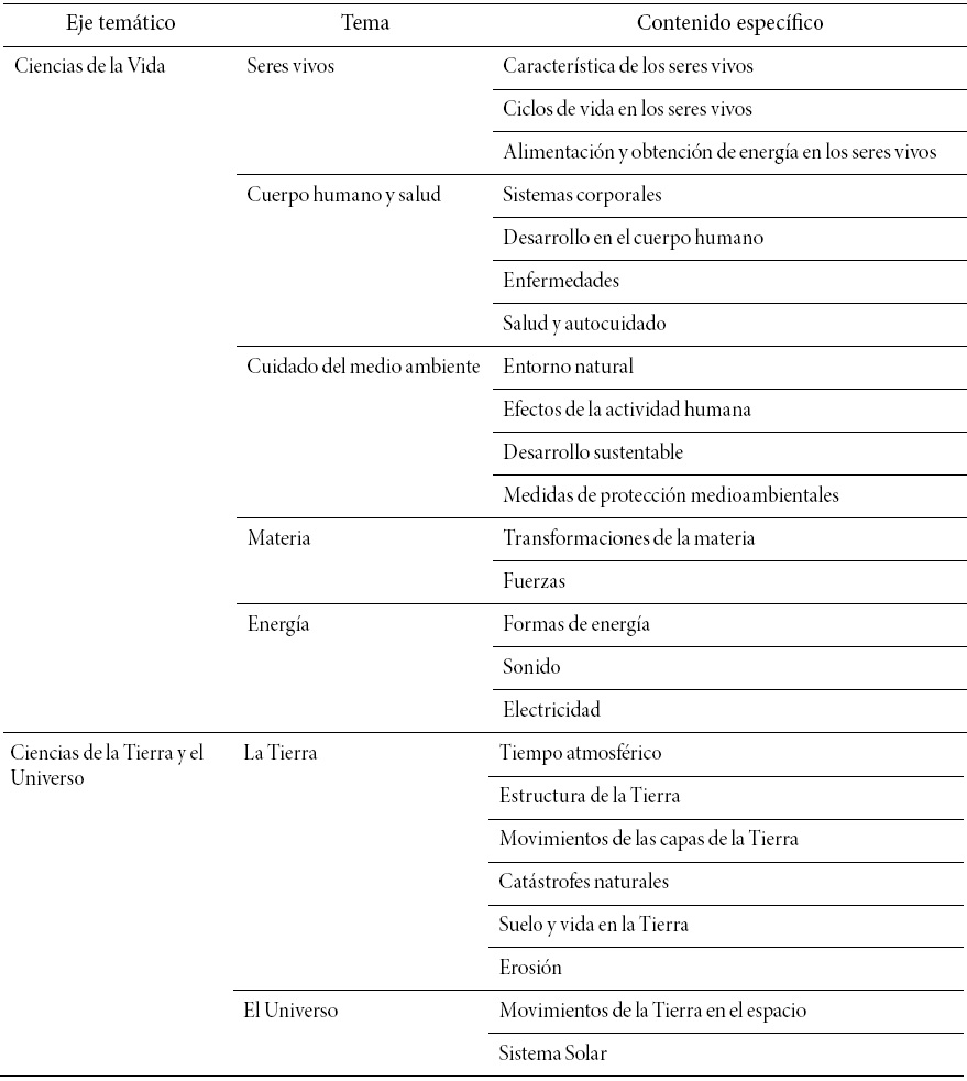 Si bien en la introducción del documento curricular se declara la importancia de que exista una aproximación “a las grandes ideas de la ciencia, cuya comprensión les permita dotar de sentido a los fenómenos del mundo que los rodea” (Ministerio de Educación, 2012: 138); se observa que el criterio de organización de los temas y contenidos específicos está vinculado a las disciplinas, más que a conceptos relacionados con fenómenos del mundo natural que requieren de la integración interdisciplinaria para su comprensión.