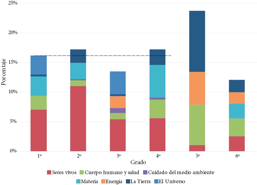 El Gráfico 1 muestra la distribución de los contenidos de 1° a 6° grado de las Bases Curriculares, con un promedio de 49.3 objetos por grado escolar. En dicho gráfico, la altura de las barras representa el porcentaje relativo de cada grado con respecto a todos los contenidos propuestos entre 1° y 6° grado; el área de cada zona dentro de las barras representa el porcentaje relativo de cada tema con respecto al total de contenidos cubiertos en ese grado; y la línea entrecortada horizontal corresponde a 16.7 por ciento, es decir, la distribución uniforme de los contenidos en los diferentes grados. Esta línea permite distinguir los cursos con una menor o mayor concentración de contenidos. Se observa que en 5° grado existe un mayor porcentaje de contenidos (casi 25 por ciento) en relación con los otros grados. Además, en el nivel primario los temas se focalizan en Tierra (18 por ciento), cuerpo humano y salud (17 por ciento) y materia (14 por ciento). En 3° y 6° grados se aprecia un porcentaje menor de contenidos en relación con el nivel educativo.