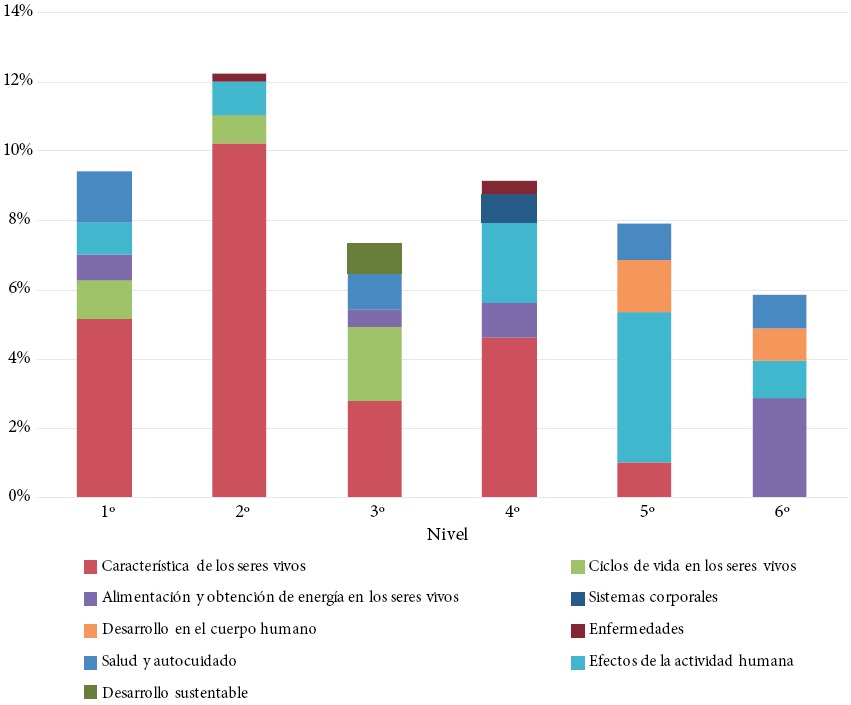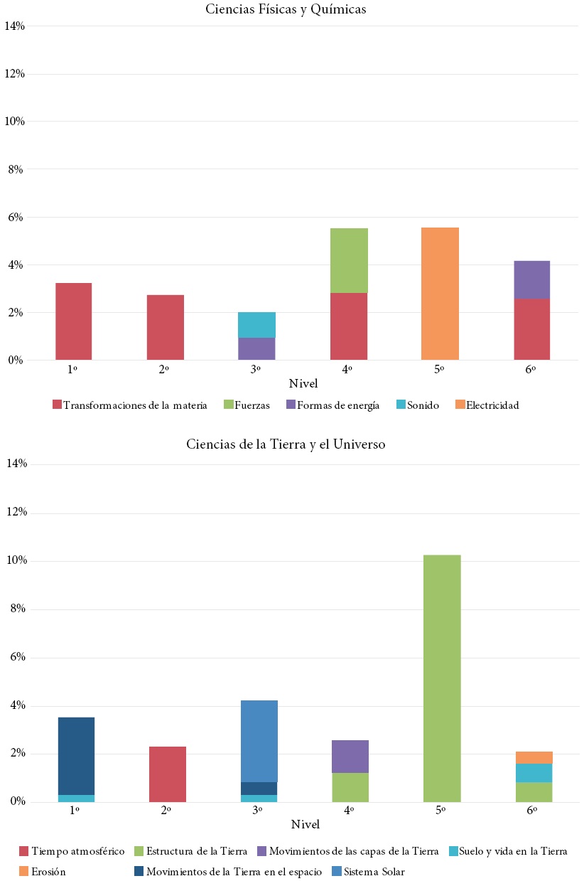 Con respecto a la variedad de temas cubiertos, se observa que no hay una relación entre la proporción de contenidos del nivel y los temas cubiertos en él: por ejemplo, en 3° grado, con un porcentaje menor de contenidos, destaca que 14 por ciento del total de éstos está distribuido en seis temas (seres vivos, cuerpo humano y salud, cuidado del medio ambiente, energía, Tierra y Universo). De igual modo, en 6° grado se abordan cinco temas (seres vivos, cuerpo humano y salud, materia, energía y Tierra) que representan 12 por ciento del total de temas en todos los niveles. El 5° grado, el nivel con la mayor proporción de contenidos, incluye sólo cuatro temas (seres vivos, cuerpo humano y salud, energía y Tierra).