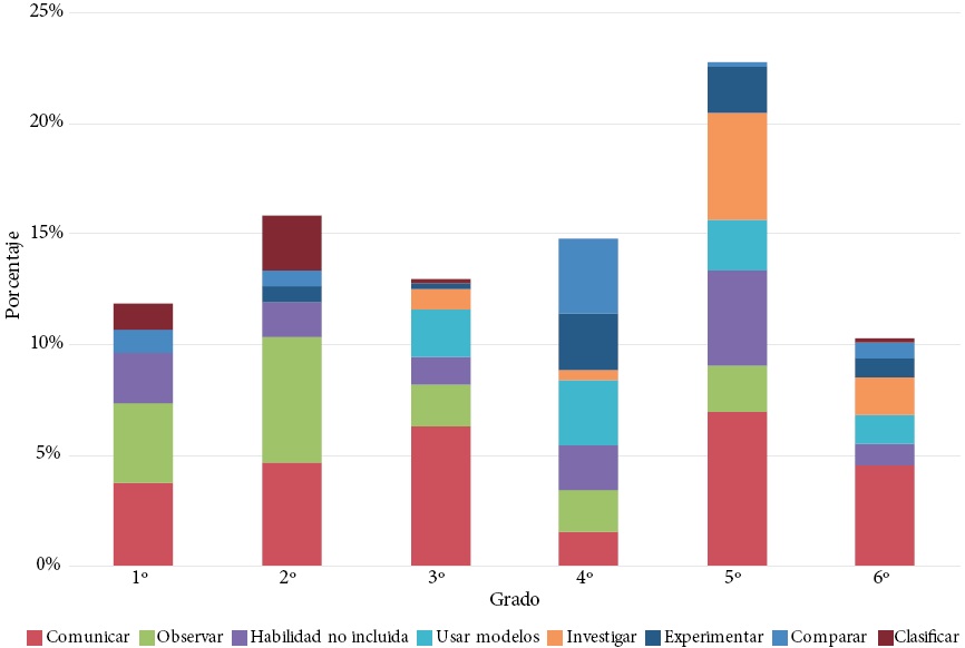 En las Bases Curriculares 2012 se observa que las habilidades científicas y etapas de investigación asociadas a los objetivos de aprendizaje no son desarrolladas en todos los grados escolares, aun cuando es declarado su carácter transversal. De las habilidades identificadas en los objetivos de aprendizaje de 1°, 2°, 3° y 5° grado prevalecen sólo ocho habilidades científicas, en 4° grado se desarrollan 11, y en 6° grado aumentan a 12. Al respecto, el Gráfico 5 muestra la distribución de las habilidades científicas definidas por el currículo nacional.