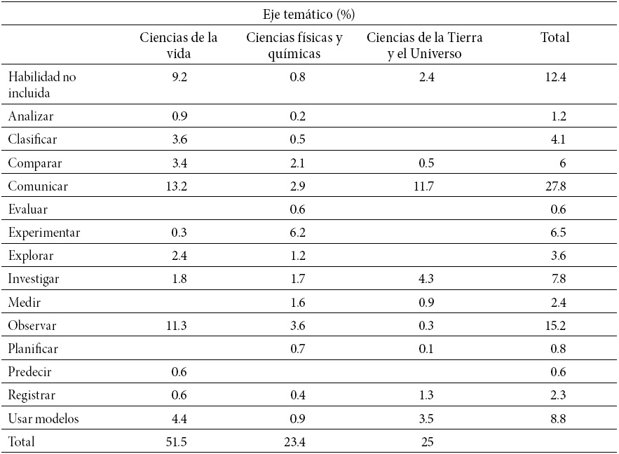 En la Tabla 1 se presenta la distribución de las habilidades científicas asociadas a los temas científicos en las Bases Curriculares 2012. La habilidad científica con mayor presencia es comunicar, con un 27.8 por ciento, que está asociada principalmente a Ciencias de la Vida (13.2 por ciento) y Ciencias de la Tierra (11.7 por ciento). La siguiente habilidad es observar, con un 15.2 por ciento, que está localizado mayoritariamente en el eje Ciencias de la Vida (11.3 por ciento); de igual modo, la mitad de porcentaje total de comunicar está concentrado en Ciencias de la Vida (13.2 por ciento).