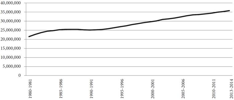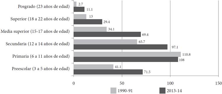 En México son evidentes los avances que se han logrado en materia de cobertura educativa para la población. En un lapso de aproximadamente 34 años la matrícula total inscrita (desde preescolar hasta superior, incluyendo la capacitación para el trabajo) pasó de 21.5 a 35.7 millones de alumnos (Gráfica 1), lo cual implicó una tasa de crecimiento de aproximadamente 2 por ciento anual. Este crecimiento se reflejó de forma importante en el aumento de las tasas brutas de cobertura en los diferentes tipos y niveles educativos. Según las cifras del gobierno, para 2014, en educación preescolar la cobertura era próxima al 72 por ciento; y en primaria y secundaria hipotéticamente el sistema estaba en condiciones de atender a casi todos los niños, niñas y jóvenes en edad de cursar estos niveles. En educación media superior la cobertura bruta era cercana a 70 por ciento, y en educación superior a 30 por ciento (Gráfica 2).
