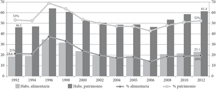 Por su parte, los datos del Consejo Nacional de Evaluación de la Política de Desarrollo Social (CONEVAL) muestran que el porcentaje de la población en pobreza aumentó considerablemente entre 1992 y 2002, pero después tendió a mantenerse más o menos estable entre 2002 y 2012. En resumen, los porcentajes de población en pobreza alimentaria y en pobreza de patrimonio en 1992 eran casi los mismos que en 2014. Esto no es alentador, dado que por el efecto del crecimiento demográfico la cantidad real de población en condiciones de pobreza aumentó considerablemente: mientras que en 1992 había 18.6 millones de personas en pobreza alimentaria, en 2012 esta cifra llegó a los 23.1 millones. Por su parte, las cifras correspondientes para la pobreza de patrimonio pasaron de 46.1 a 61.4 millones de personas (Gráfica 10). Lo anterior revela un panorama nada halagador, ya que la pobreza alimentaria implica la incapacidad de los hogares para obtener una canasta básica alimentaria aun si destinaran todos sus recursos disponibles para comprar sólo eso; mientras que la pobreza de patrimonio se refiere a no contar con recursos para adquirir la canasta alimentaria y para cubrir los gastos necesarios en salud, vestido, vivienda, transporte y educación de los miembros del hogar (CONEVAL, s/f).
