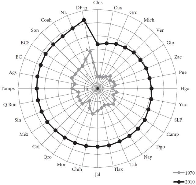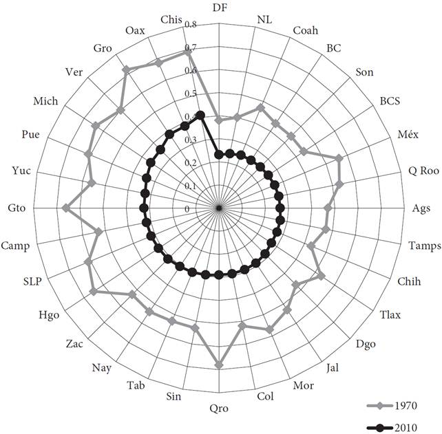 No obstante lo anterior, hay datos que confirman que los avances logrados en la cobertura educativa muestran importantes señas de inequidad, asociadas a las desigualdades sociales y económicas existentes entre la población. Por ejemplo, los trabajos de Felipe Martínez Rizo (2012) indican que si bien hemos avanzado en términos educativos, estos avances mantienen las asimetrías existentes en la distribución de las oportunidades educativas: así tenemos que entre 1970 y 2010, si bien aumentó la escolaridad promedio de la población de 15 años y más de 3.4 a 8.7 grados, en las entidades más pobres (Chiapas, Guerrero y Oaxaca) el promedio de escolaridad en 2010 era ligeramente superior al que tenía el Distrito Federal 40 años antes (Gráfica 3). Una tendencia similar se observa respecto de la distribución de la escolaridad al interior de las entidades federativas entre 1970 y 2010, pues aunque se advierte una disminución de la inequidad, vista a través del valor del índice de Gini,1 el cual decrece de 0.55 a 0.30 en el periodo indicado; nuevamente las entidades más pobres (Chiapas, Guerrero y Oaxaca) son las que muestran los índices menos favorables. Ello indica que la desigualdad en la distribución educativa es todavía mayor a la que existía entre esos estados y el Distrito Federal y Nuevo León hace 40 años (Gráfica 4).
