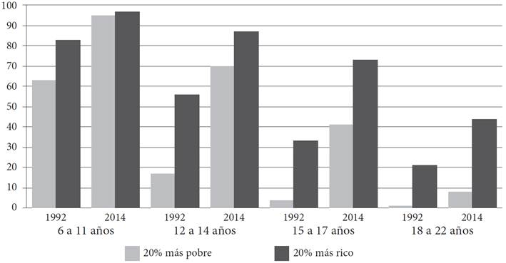 Las desigualdades educativas se encuentran estrechamente asociadas a la distribución del ingreso en México, pues en el 20 por ciento de los hogares más pobres el porcentaje de asistencia escolar se encuentra sistemáticamente por debajo del porcentaje que alcanza en el 20 por ciento de los hogares con los mayores recursos. Asimismo, se aprecia que esta diferencia se incrementa según aumenta la edad de las personas: en 2014, mientras que en el 20 por ciento de los hogares con menores recursos la asistencia escolar era de 41 por ciento en el grupo de edad de 15 a 17, y de 8 por ciento en el de 18 a 22 años; en el 20 por ciento de los hogares más ricos estos porcentajes eran de 73 y 44 para los grupos de edad respectivos (Gráfica 5).