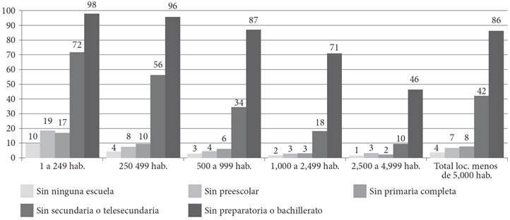 Las cifras de localidades sin escuelas son alarmantes y revelan el aspecto más grave de la desigualdad educativa. Así tenemos que en las localidades de menos de cinco mil habitantes, 4 por ciento no cuenta con algún tipo de escuela, 7 por ciento no tiene preescolar, 8 por ciento no tiene primaria completa, 42 por ciento no tiene secundaria y 86 por ciento no tiene escuelas de nivel medio superior. Este problema se agrava conforme disminuye el tamaño de las localidades (Gráfica 6). En un contexto donde la obligatoriedad de la educación se ha ampliado hasta el nivel medio superior, las cifras anteriores reflejan la situación más drástica de desigualdad educativa y el bajo impacto de las reformas constantes aplicadas al sector escolar para revertirla.