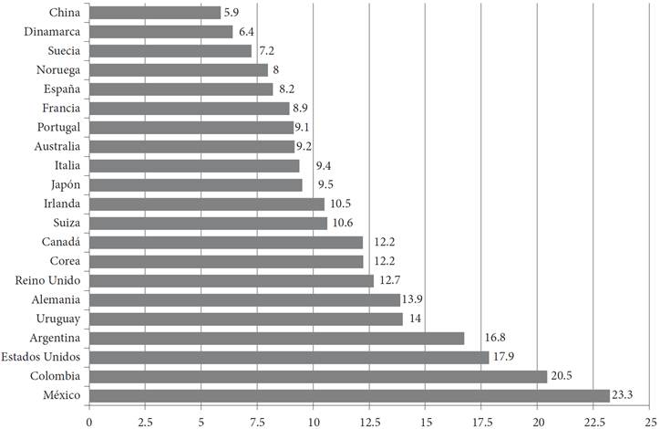 En los últimos 15 años, en México, el producto interno bruto (PIB) ha crecido a una tasa un poco mayor a 2 por ciento anual, aunque con importantes variaciones debido a las frecuentes crisis económicas, muchas de ellas reflejo de las crisis mundiales. Aun cuando el incremento no se haya dado en los niveles deseados, la economía sí ha crecido, pero lo que no se ve llegar es la esperada mejoría en las condiciones de vida de la mayoría de la gente. La explicación se encuentra en la desigual distribución del ingreso, pues mientras persiste la pobreza, la riqueza de las familias más acaudalas del país aumenta de forma impresionante. En 2012, se estimaba que el 1 por ciento de los hogares más ricos del país concentraba el 23 por ciento del ingreso total del país; porcentaje que contrasta con los niveles de concentración del ingreso existentes en otros países (Campos et al., 2014, 2016; Esquivel, 2015) (Gráfica 7).