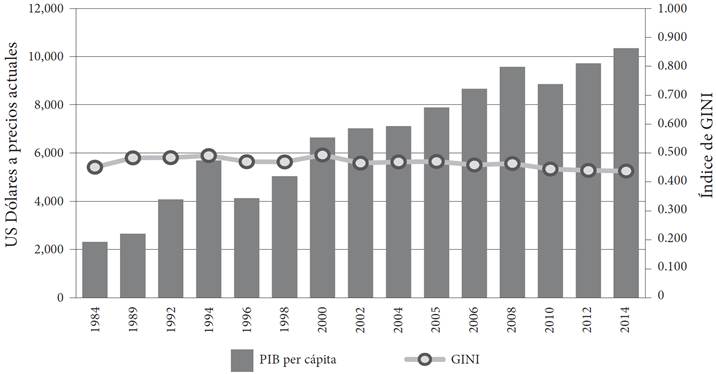 Por otra parte, aunque se considera que los datos de las Encuestas de Ingreso y Gasto de los Hogares (ENIGH) tienden a subestimar los ingresos de los hogares más acaudalados en México (Esquivel 2015; Díaz, 2015), permiten observar el comportamiento que ha tenido la distribución del ingreso en los últimos años. Como puede verse en la Gráfica 8, a pesar de que dicho ingreso, en términos del Producto Interno Bruto (PIB) per cápita, ha aumentado considerablemente desde 1984, la distribución del ingreso, visto por el valor del índice de Gini, no muestra cambios sustanciales entre esa fecha y el 2014. Es decir, hay más riqueza, pero ésta se sigue distribuyendo de manera inequitativa.