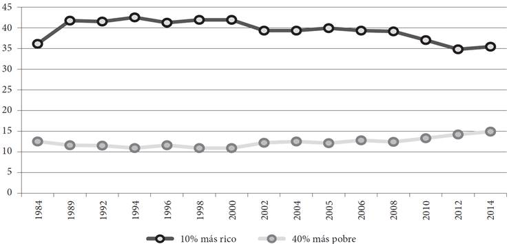 Esto se confirma al observar que, en el periodo considerado, el ingreso del 10 por ciento de los hogares más ricos, y el del 40 por ciento de los hogares más pobres muestran casi la misma tendencia. Durante los años noventa y la primera década del presente siglo los ingresos de los hogares más acaudalados aumentaron, para disminuir en los últimos años al nivel que tenían en 1984 (Gráfica 9).