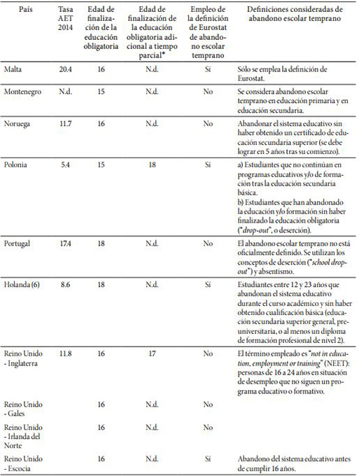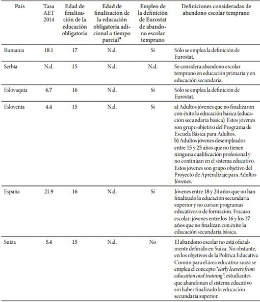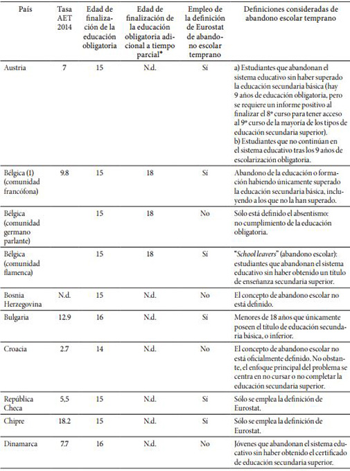 En la mayoría de los países europeos se considera abandono escolar temprano cuando se abandona el sistema educativo sin continuar en la educación secundaria superior o programas formativos de nivel equivalente, aunque se haya superado la educación secundaria básica. Este grupo incluye a países donde se consideran los 15 años como edad mínima para abandonar la educación obligatoria: Eslovenia, República Checa, Austria, Suiza y Chipre. También incluye a Croacia, con 14 años como edad mínima para abandonar la educación. Con la misma definición encontramos a Bulgaria, Dinamarca, Estonia, Francia, Luxemburgo, Finlandia, Suecia, Islandia, Noruega, Italia, Hungría, Macedonia, Eslovaquia, Irlanda, Letonia, Malta, Bulgaria y España, donde los 16 es la edad mínima para abandonar el sistema educativo. Rumania considera los 17 años. Con el mismo criterio sobre abandono escolar, en Polonia y en la región flamenca de Bélgica, la edad límite para abandonar la educación es 15 años, y 18 para la educación obligatoria a tiempo parcial combinada con trabajo. En Holanda y Portugal la edad límite es 18 años, y en Hungría 16, o 18 para la educación obligatoria a tiempo parcial combinada con trabajo. En Noruega se considera abandono escolar si un estudiante ha cursado educación secundaria superior durante al menos cinco años o más (Comisión Europea/Eurydice, 2014; The Swiss Conference of Cantonal Ministers of Education, 2015). En México se considera abandono escolar el abandono del sistema educativo sin haber superado la educación media superior (nivel 3 de la clasificación CINE, finalización a los 17 años).1
