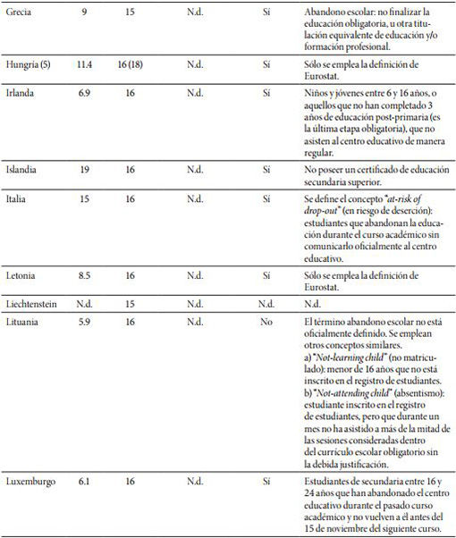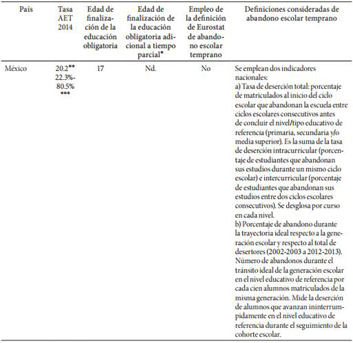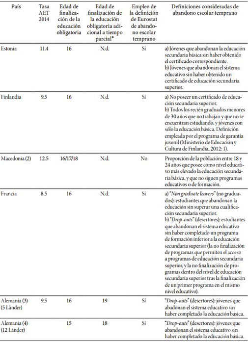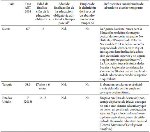 Así, en España se considera la definición de Eurostat junto a una nacional, fracaso escolar, asociada al sistema educativo español y menos restrictiva. Eurostat considera dentro de abandono escolar a todos aquellos que poseen la educación secundaria básica pero que no siguen ningún programa educativo, criterio considerado en países europeos con tasas de abandono escolar por debajo de 10 por ciento, como Austria, Bélgica, Croacia, República Checa, Dinamarca, Finlandia, Francia, Alemania, Grecia, Irlanda, Letonia, Luxemburgo, Polonia, Holanda, Eslovaquia, Eslovenia, Suiza, y Suecia, además de en Estados Unidos y México (Anexo I). En relación a la edad minima para abandonar el sistema educativo, España y México consideran 16 y 17 años, respectivamente. Estas edades límite y otras consideraciones son coincidentes con aquellas tenidas en cuenta en países con tasas de abandono escolar inferiores al 10 por ciento, como Dinamarca, Finlandia, Francia, Irlanda, Letonia, Luxemburgo, Eslovaquia y Suecia, que es el objetivo europeo para el año 2020. Pero también en la misma línea de Bulgaria, Estonia, Hungría, Islandia, Italia, Malta, Noruega y Escocia, con tasas de abandono escolar superiores a 10 por ciento.