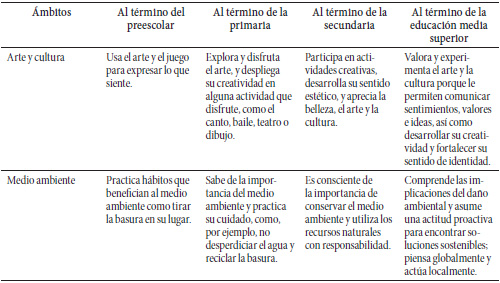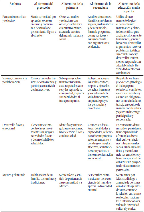 Tiene valores, se comporta éticamente y convive de manera armónica; conoce y respeta la ley; defiende el Estado de Derecho, la democracia y los derechos humanos; promueve la igualdad de género; valora la pluralidad étnica y cultural de nuestro país y del mundo; conoce la historia que nos une y da identidad en el contexto global; siente amor por México; tiene creatividad, sentido estético y aprecio por la cultura y las artes; cuida el medio ambiente; participa de manera responsable en la vida pública; hace aportaciones al desarrollo sostenible de su comunidad, su país y del mundo.
