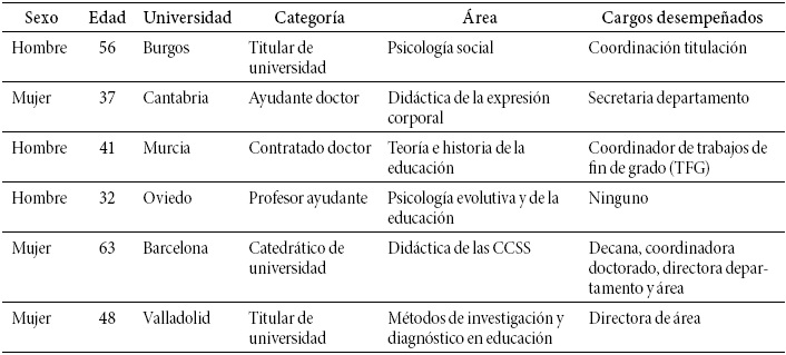 Todos se ubican en diferentes universidades españolas, categorías profesionales y áreas de conocimiento, y han desempeñado o desempeñan diversos cargos académicos. Estos datos pueden observarse de manera detallada en la Tabla 1.