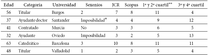 Se observa cómo los docentes de menor edad y categoría profesional son los que más publicaciones tienen en revistas de menor impacto. La profesora catedrática es la que más acredita en JCR y Scopus, tras el profesor titular de la Universidad de Burgos. Sin embargo, la profesora titular de la Universidad de Valladolid tiene menor número que los dos ayudantes doctores y el contratado doctor.