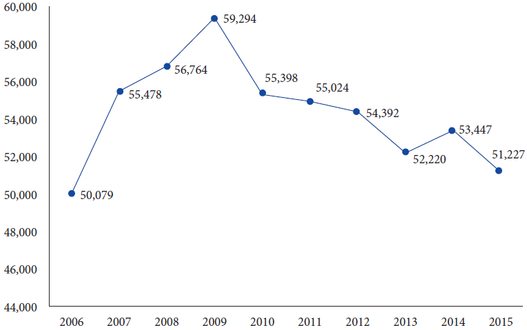 El indicador subsidio por alumno pondera la evolución del presupuesto asignado en educación superior y posgrado respecto al crecimiento de la matrícula pública.12 Los datos del sexenio 2012-2018 muestran una disminución en el financiamiento unitario, pues mientras la matrícula creció cada año en 4.9 por ciento, el presupuesto federal lo hizo en 2.9 por ciento, lo que contrasta con el saldo favorable al financiamiento en el gobierno de Felipe Calderón (6.3 por ciento de crecimiento anual del presupuesto contra 4.8 por ciento de la matrícula). Al inicio de la administración de Peña Nieto el subsidio por alumno, a pesos de 2015, fue de 54 mil 392 pesos, y tres años después disminuyó a 51 mil 227 pesos (Gráfica 1).