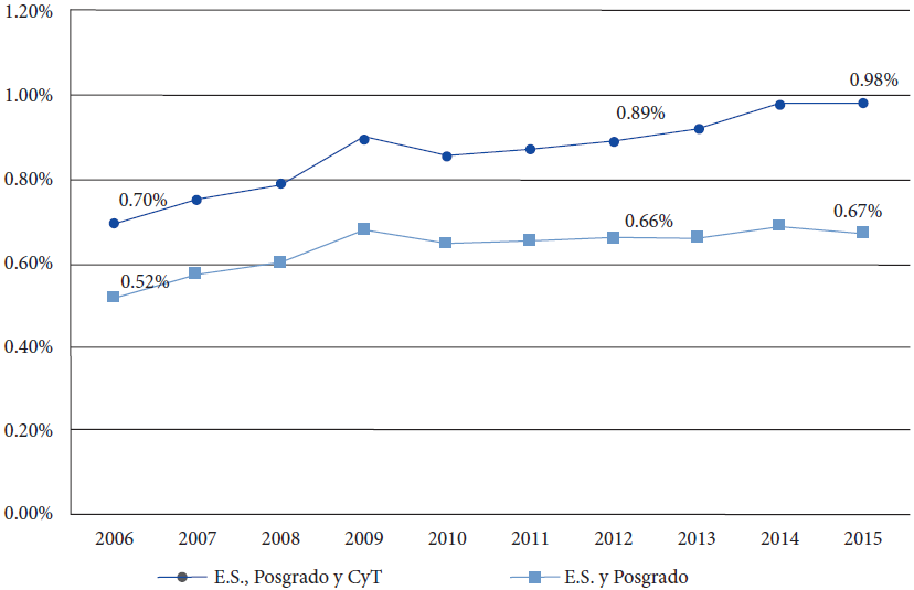 Indicador: gasto en investigación científica y desarrollo experimental (GIDE) ejecutado por las instituciones de educación superior (IES) respecto al producto interno bruto (PIB). 2012: 0.12 por ciento. 2015: 0.14 por ciento.6 Meta a 2018: 0.25 por ciento.