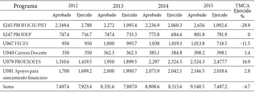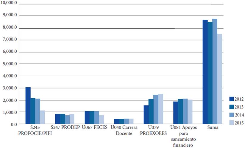 Como era de esperarse, los primeros programas presupuestarios a ser ajustados fueron los extraordinarios, considerados como fondos sometidos a concurso de carácter no regularizable, pese a que en los hechos formaban parte de la operación ordinaria de las universidades al estar destinados, en una buena medida, al desarrollo de los proyectos sustantivos de sus diversas unidades académicas. Es el caso de los proyectos financiados por los dos fondos que sufrieron ajustes en 2015 (FECES y PROFOCIE) que están dirigidos al desarrollo de los programas integrales de fortalecimiento institucional; a lo largo de 15 años estos programas han constituido el principal instrumento para el mejoramiento de los indicadores de calidad con que se evalúa el desempeño institucional (capacidad y competitividad académica).