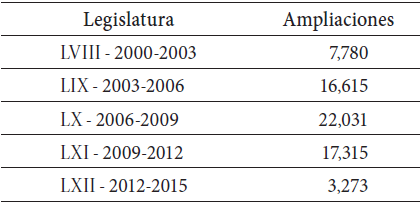 A diferencia de los arreglos interparlamentarios establecidos en la Cámara de Diputados, y entre el Ejecutivo y el Congreso a partir de la alternancia política, el nuevo gobierno impulsó nuevos acuerdos políticos luego del competido proceso electoral. Las negociaciones presupuestales de 2007 a 2012 correspondieron a las LX y LXI legislaturas: en la primera se habían obtenido ampliaciones presupuestales por 22 mil millones de pesos,8 y en la segunda por cerca de 17 mil millones de pesos. A diferencia de ello, en los presupuestos correspondientes a los tres ejercicios fiscales del gobierno de Enrique Peña Nieto -correspondientes a la LXII Legislatura- las ampliaciones fueron de 3.3 miles de millones de pesos: las menores de las últimas cuatro legislaturas (Tabla 1).