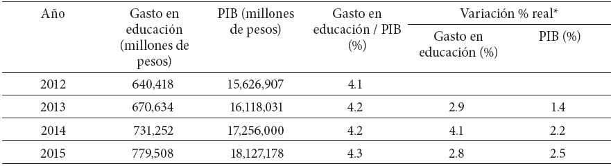 Si a los recursos económicos aportados por la federación se suma el destinado por los estados y por los particulares, en 2015 el gasto nacional alcanzó 6.8 por ciento del PIB, ligeramente por encima del 6.6 por ciento de 2012. Sin embargo, la participación del gasto público en educación fue de 5.4 por ciento del PIB, muy por debajo del 8 por ciento establecido en el artículo 25 de la Ley General de Educación.