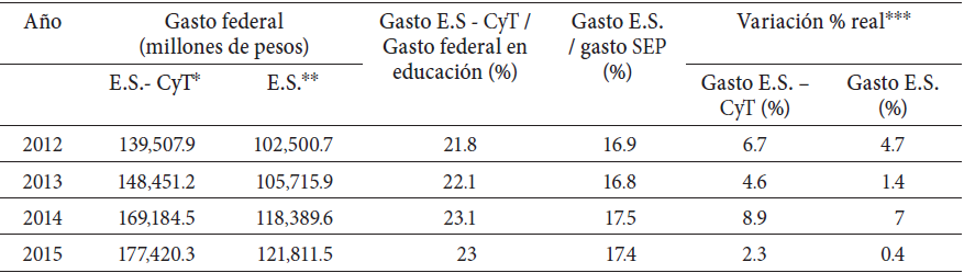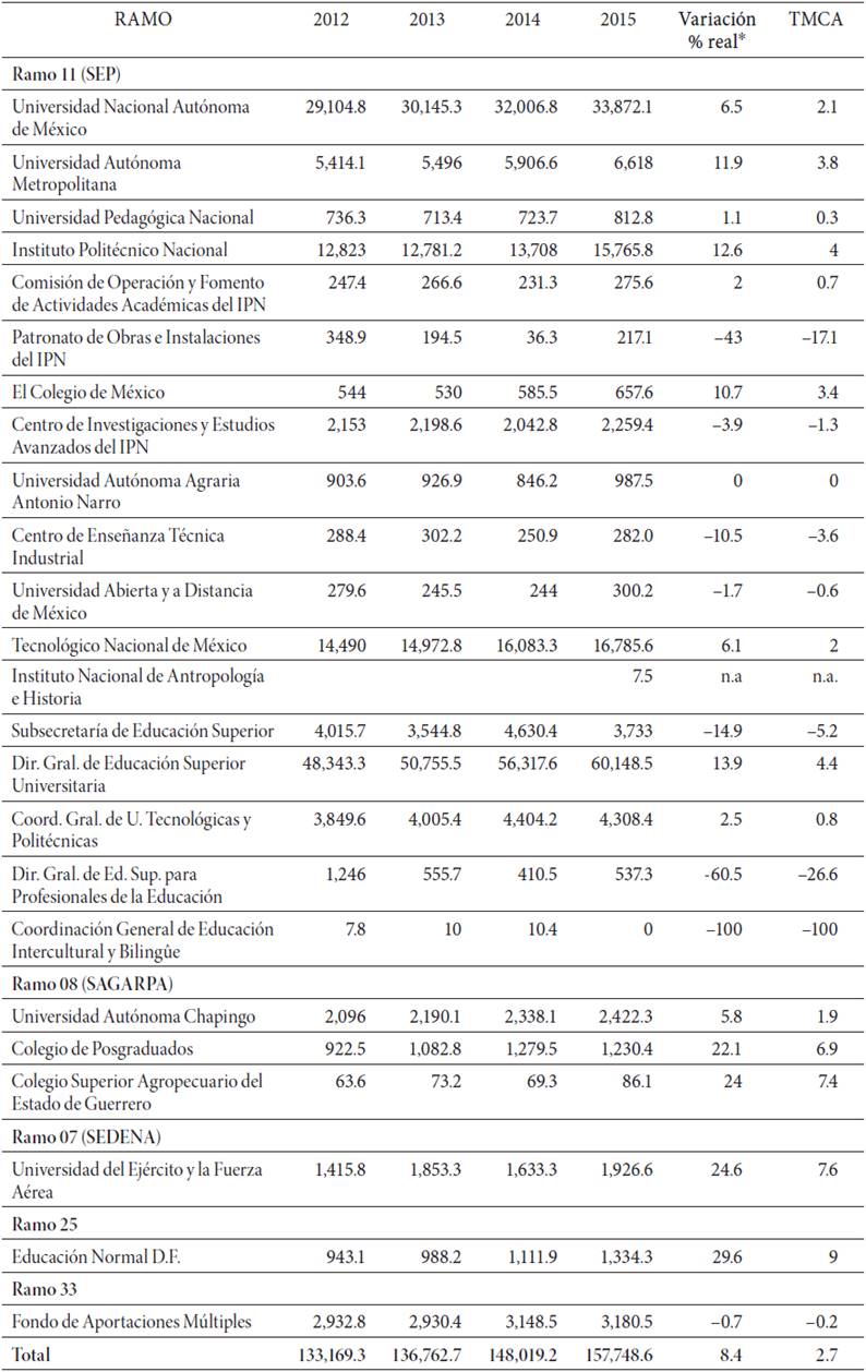 El financiamiento federal a las instituciones públicas de educación superior (IPES) se destina en diferentes funciones y subfunciones presupuestales: gobierno, cultura, CyT, educación media superior, educación superior y posgrado.13 En el periodo 2012-2015, el presusuesto ejercido tuvo un incremento real de 8.4 por ciento, con una tasa media de crecimiento anual de 2.7 por ciento.