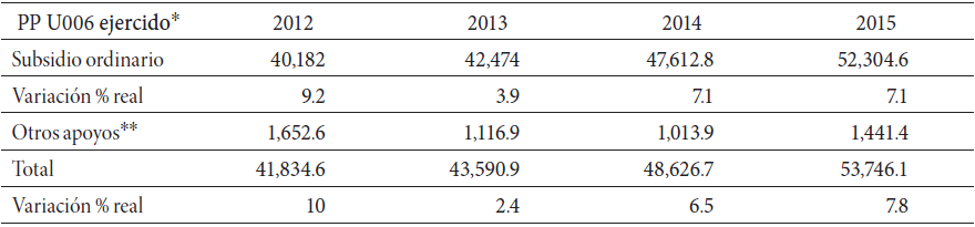Con esta evolución anual, el saldo neto en la primera mitad de la administración fue favorable para el subsidio ordinario de las UPES (Tabla 5); sin embargo, este crecimiento fue inferior al verificado en el sexenio de Felipe Calderón, que tuvo una tasa media anual de 8.0 por ciento. Por otra parte, continuaron observándose problemas de concurrencia del gobierno federal y de los gobiernos estatales para la asignación del subsidio ordinario a las instituciones, las cuales realizaron negociaciones con sus gobernadores y con la SEP para la ministración oportuna y completa de los recursos aprobados. En el caso de la Universidad Veracruzana, que había dejado de recibir recursos comprometidos por el gobierno estatal, a finales de 2015 se desató la movilización de los universitarios para demandar al gobierno el cumplimiento de sus obligaciones.