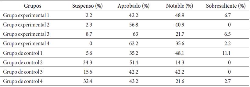 En la Tabla 1 se presentan los resultados académicos (en porcentaje) de los ocho grupos-aula que participaron en el estudio. La Tabla 2 resume estos resultados tras agrupar los datos en un único grupo experimental y un único grupo de control.