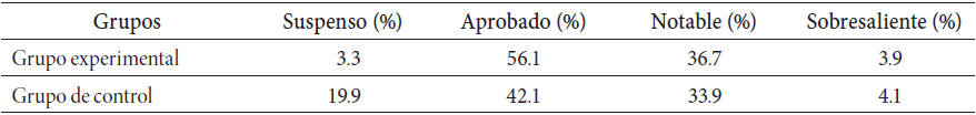 Las Tablas 1 y 2 reflejan una tendencia similar en el rendimiento académico de todos los participantes. La distribución se aproxima a la normal, con un ligero sesgo hacia la derecha. De ello se puede inferir que la propuesta didáctica se ajustó al perfil del estudiante al que iba dirigido. Las tasas de superación de las asignaturas fueron elevadas: 96.7 por ciento en el caso del grupo experimental, y 80.1 por ciento en el caso del grupo de control. No obstante, la Tabla 2 muestra que fue en esta tasa en donde se halla la diferencia entre el grupo experimental y el de control: mientras el grupo experimental presenta muy pocos suspensos (un 3.3 por ciento), el de control arroja casi un 20 por ciento. Todos los porcentajes de aprobados y notables del grupo experimental superan los del grupo de control y la de sobresalientes apenas difiere en un 0.2 por ciento. También se observa que cuanto mayor es la nota final (notable o sobresaliente) menor es la diferencia entre los dos grupos. Si se analizan estas calificaciones a partir de los descriptores recogidos en las rúbricas, se concluye que más de la mitad de los estudiantes se situó en el tercero de los cuatro niveles de desempeño.