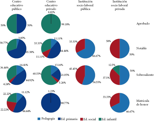 En la Gráfica 2 se aprecia la distribución del alumnado a partir del lugar de realización y las calificaciones obtenidas en prácticas anteriormente realizadas. De esta gráfica por sectores se deduce que sus calificaciones eran bastante altas, y que los/as estudiantes de Pedagogía y Educación social realizaban su periodo de formación práctica en instituciones socio-laborales tanto públicas como privadas, lo cual nos induce a pensar que, para el alumnado de Pedagogía, la educación reglada oficial ya no es su principal salida profesional, sino que está buscando itinerarios alternativos. En cuanto a las calificaciones obtenidas en los centros educativos públicos, éstas son más altas que las obtenidas en los centros educativos privados; a diferencia de las instituciones socio-laborales públicas, cuyas calificaciones son inferiores a las instituciones socio-laborales privadas. El alumnado de Pedagogía obtuvo un porcentaje mayor de calificaciones positivas que el resto.