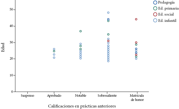En la Gráfica 3 se muestra la distribución de edad del alumnado, tanto respecto a la carrera que están cursando como respecto a las calificaciones obtenidas en prácticas anteriores, con el fin de conocer la relación existente entre la madurez y el rendimiento por carrera. Como puede verse, la calificación más común es la de sobresaliente; además, los alumnos/as más jóvenes de Educación infantil tienen un mayor número de sobresalientes. No existe una tendencia concreta respecto a la edad en la elección de carrera. Es destacable que ningún alumno/a encuestado ha suspendido la asignatura de prácticas y que sólo alumnos/as de las titulaciones de Educación primaria e infantil obtuvieron calificaciones bajas, concretamente aprobados, y que las matrículas de honor se reparten entre todas las carreras. Esto induce a pensar cómo están evaluando el practicum, es decir, si realmente se exige en él lo mismo que en otra asignatura de la titulación o se está considerando como una asignatura de escasa relevancia. ¿Es el profesorado consciente del sentido de esta materia en el plan de estudios correspondiente? ¿Existe una relación en cuanto a grado de exigencia entre el número de créditos correspondiente a una materia de cualquier carrera y una de prácticas externas? ¿Está garantizada una buena nota con el mero hecho de asistir al centro de prácticas y entregar un documento? Estas son cuestiones sobre las que el profesorado implicado en la tutorización de las mismas tendría que reflexionar.