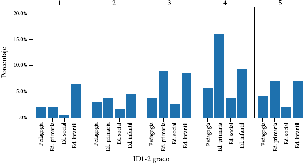 Al plantear si la oferta de plazas totales es suficientemente amplia (x2.2.2), también existen diferencias, sobre todo entre Pedagogía y Educación primaria, con p-valor=.001; Pedagogía y Educación infantil, con p-valor=.001; Educación primaria y Educación social, con p-valor=.001; y entre Educación social y Educación infantil, con p-valor=.001. Cuando al alumnado se le preguntó si el número de plazas ofertadas por centro es adecuado (x2.2.3) tampoco hubo acuerdo, y se rechaza la hipótesis nula; las principales discrepancias se encontraron en Pedagogía y Educación primaria, con p-valor=.022; Pedagogía y Educación infantil, con p-valor=.001; Educación primaria y Educación social, con p-valor=.003; y con Educación infantil, con p-valor=.031; así como Educación social con Educación infantil, con p-valor=.001.