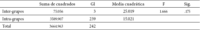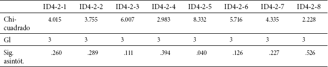La hipótesis nula fue aceptada en el resto de los casos, puesto que no se muestran diferencias entre las medias. Los ítems considerados en este contraste son x4.2.1: las condiciones formales de presentación son aspectos importantes a la hora de evaluar el portafolios; x4.2.2: la introducción de valoraciones, argumentaciones y aportaciones personales es fundamental para entender el papel del alumno en el desarrollo de las prácticas; x4.2.3: el establecimiento de relaciones entre los contenidos teóricos y las prácticas constituye un elemento para verificar las evidencias de aprendizaje; x4.2.4: la profundidad de análisis y reflexiones personales da cuenta de la evolución y maduración académica de los estudiantes; x4.2.6: existe un feedback adecuado durante la elaboración del portafolios por parte del tutor académico; x4.2.7: la utilización de portafolios digitales (Mahara) facilita la elaboración del mismo; y x4.2.8: en general, estos criterios de evaluación son aplicados y operativos. En este caso, al realizar el análisis post hoc de comparaciones múltiples de Scheffé no se identificaron diferencias significativas entre las carreras.