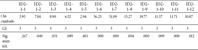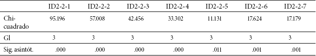 En el contraste de hipótesis planteado en la Tabla 4 se rechaza la hipótesis nula, puesto que sí existen diferencias significativas en todos los ítems presentados. Dichos ítems se refieren a la existencia de una adecuada variedad de centros/instituciones de prácticas (x2.2.1); según el análisis de comparaciones múltiples de Scheffé, las principales diferencias se encuentran entre los siguientes grupos: Pedagogía y Educación primaria, con p-valor =.001; Pedagogía y Educación infantil, con p-valor=.001; Educación primaria y Educación social, con p-valor=.001; y Educación social y Educación infantil, con p-valor=.001.