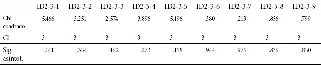 Dentro de esta dimensión, el único contraste en el que se puede aceptar la hipótesis nula es el relacionado con la variable x3.2.5: el tutor profesional se comunica habitualmente con el tutor académico (χ2=4.038, pvalor=.257), puesto que no hay diferencia entre la media de los alumnos por carrera.