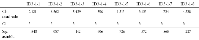 Como puede verse, las prácticas realizadas con anterioridad fueron calificadas positivamente por el alumnado: 69.65 por ciento las calificó como mucho mejores, y 1.9 por ciento sólo las aprobaron. Para profundizar más en los resultados obtenidos se realizaron varios contrastes de hipótesis mediante pruebas no paramétricas para muestras independientes, ante la imposibilidad de garantizar los supuestos paramétricos de homocedasticidad y normalidad. Mediante la prueba H de Kruskal-Wallis, que se realizó para analizar la diferencia en la distribución de rangos entre los grupos, se llevó a cabo un primer contraste bilateral para identificar si el rango de edad del alumnado es el mismo en las distintas titulaciones. Como se puede apreciar en la Tabla 2, el análisis arroja que no existe significación estadística (p-valor=.175), por lo que se rechaza la hipótesis nula.