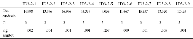 Es decir, la edad no determina la preferencia por cursar una titulación u otra, ya que la elección de carrera estará relacionada con factores como la vocación, los intereses profesionales y los intereses personales, entre otros. En este estudio, se realizó un contraste de hipótesis para pruebas no paramétricas para k muestras independientes en cada dimensión planteada en la prueba, según la titulación que está cursando el alumnado, para contrastar la igualdad de medias. A continuación se muestran las variables cuyas medias presentan diferencias estadísticamente significativas a un nivel de significación de 0.05. En la dimensión “organización de las prácticas: secuenciación temporal” existen 9 ítems que muestran diferencias estadísticamente significativas, como podemos apreciar en la Tabla 3.