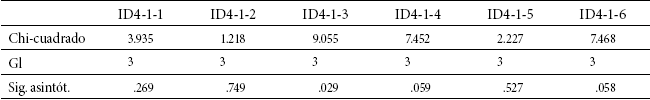 En el resto de los ítems considerados en este contraste no existen diferencias significativas, por lo que se acepta la hipótesis nula. La media del alumnado no difiere entre una disciplina y otra en lo que se refiere a x4.1.1: los procedimientos de evaluación están claramente definidos previamente (χ2=3.935, p-valor=.269); x4.1.2: la participación del alumno en los seminarios es considerado un criterio de evaluación (χ2=1.218, p-valor=.749); x4.1.4: la valoración del trabajo del alumno por parte del tutor profesional está adecuadamente considerada a la hora de calificar, como se puede apreciar en el análisis de varianza (χ2= 7.452, p-valor=.059); en x4.1.5: la valoración del desarrollo, organización y gestión de las prácticas externas, por parte de los alumnos a través de un cuestionario es pertinente (χ2=2.227, p-valor=.527); y, por último, en la variable x4.1.6: la calificación final debe estar determinada un 50 por ciento por el tutor académico y otro 50 por ciento por el tutor profesional (χ2=7.468, p-valor=.058).