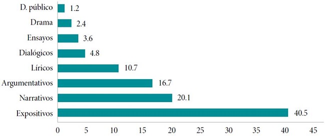 La primera mayoría corresponde a expositivos (40.5 por ciento); la segunda, a los narrativos (20.1 por ciento) y la tercera, a los argumentativos (16.7 por ciento). Lírica, diálogo, ensayo, drama y discurso enunciado en situación pública son minoritarios.