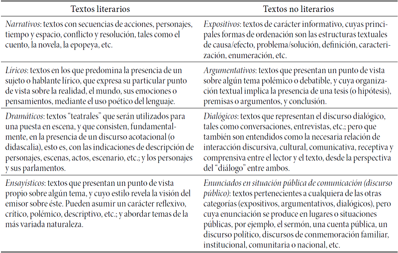 Para efectos de análisis del corpus, en esta investigación se mantuvo la clasificación textual que se utilizó en cada prueba PSU-lenguaje, acorde con el marco curricular (1998) y los programas de estudio vigentes en Chile, en el periodo 2005-2012. Esta clasificación realiza una primera distinción entre textos literarios y textos no literarios, para luego diferenciar cuatro subtipos en cada categoría (Cuadro 1).