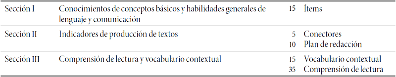 La sección I aborda aspectos de la asignatura de lenguaje y comunicación, tales como: tipos de mundo literario, clasificación de narradores o mecanismos de correferencia. La sección II incluye ítems que miden indirectamente la producción escrita: por un lado, conectores, cinco ítems en los que se debe elegir la opción que presentan los conectores y/o los marcadores textuales más adecuados para otorgar cohesión a un enunciado breve; y, por otro lado, diez ítems de plan de redacción, ejercicio que presenta un número variable de enunciados (entre cuatro y seis), en desorden, que el postulante debe ordenar para seleccionar una secuencia que tenga un desarrollo coherente de ideas. Por último, la sección III presenta 50 ítems de comprensión de lectura, distribuidos en 15 preguntas de vocabulario contextual y 35 de comprensión propiamente tal. Estas 50 preguntas están referidas a textos (completos o fragmentos) que funcionan como estímulo para evaluar la comprensión lectora.