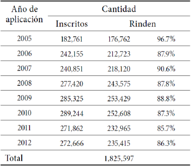 Una vía frecuentemente utilizada para evaluar la comprensión lectora de una población determinada son las pruebas, principalmente escritas, que suelen aplicarse. Unas se realizan dentro del aula, como parte del proceso de enseñanza-aprendizaje; y otras se aplican fuera de ella, en procesos estandarizados que pueden ser nacionales o internacionales. En Chile, las evaluaciones internacionales de la última década que incluyen comprensión lectora, son: PISA (2006, 2009, 2012 y 2015), SERCE (2006),2 TERCE (2013)3 y PIRLS (2015).4 Las evaluaciones nacionales son dos: la del SIMCE (Sistema de Medición de la Calidad de la Educación), desarrollado por el Ministerio de Educación, se aplica en varios niveles educacionales; y la PSU (prueba de selección universitaria), desarrollada por la Universidad de Chile, tiene el propósito de seleccionar postulantes a las universidades chilenas adscritas al Sistema Único de Admisión (SUA).5 Los resultados de estas evaluaciones proveen a los propios estudiantes, a sus familias y al país, de información acerca de su desempeño, aun cuando estas pruebas presentan limitaciones (Barrenechea, 2010; Murillo, 2010) y que se cuestionan, entre otras cosas, los usos sociales que se les dan a los resultados. Al margen de estas críticas, la PSU analizada en estas líneas (periodo 20052012), aporta información sobre el aprendizaje y el desarrollo de habilidades alcanzados por los estudiantes que egresan de la educación media, pues evalúa los contenidos mínimos obligatorios (CMO) declarados en el marco curricular de 1998. Considerando la gran cantidad de estudiantes que rinde la PSU cada año (Tabla 1), los datos que provee el análisis de las respuestas de este instrumento resultan bastante representativos de las habilidades de lectura de la población juvenil chilena que ha terminado su educación secundaria.