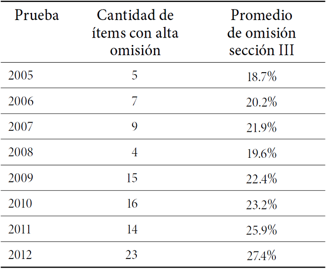 De acuerdo con la Tabla 10, la prueba con mayor cantidad de ítems de alta omisión es la de 2012 (23), seguido de la de 2010, con 16. Desde un punto de vista opuesto, el año 2008 cuenta con la menor cantidad de ítems con alta omisión (4). La Tabla 10 muestra un aumento sostenido en la omisión durante estos ocho años, pues hasta el 2008 los ítems de alta omisión eran menores a 10, en tanto, el 2009 se aprecia un brusco aumento, ya que se elevó a 15. Asimismo, el promedio de omisión también fue subiendo paulatinamente: en 2005 era 18.7 por ciento y en 2012 llegó a 27.4 por ciento, es decir, un aumento de 8.7 por ciento en siete años.