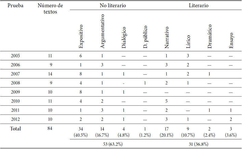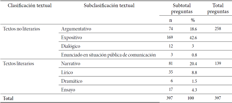 En la distribución de preguntas se observa que el mayor número corresponde a textos no literarios (64.9 por ciento, esto es, 258 preguntas). El 35.1 por ciento de ítems se refiere a textos literarios. El análisis de los ítems muestra que la mayor cantidad corresponde a comprensión de textos expositivos (42.6 por ciento); en segundo lugar se ubican los ítems referidos a textos narrativos (20.4 por ciento) y en tercer lugar los argumentativos, con un 18.6 por ciento del total; mientras tanto, los ítems referidos a textos líricos son 8.8 por ciento. Los textos minoritarios son los ensayísticos (4.3 por ciento), los dialógicos (3 por ciento), dramáticos (1.5 por ciento) y en último lugar, los enunciados en situación pública de comunicación (0.8 por ciento).