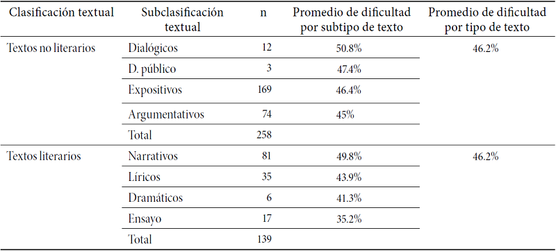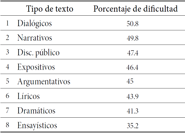Se observa que el promedio de dificultad de ambos tipos textuales (literarios y no literarios) es idéntico (46.2 por ciento). Las diferencias aparecen cuando se analizan las dificultades de cada subtipo. Hay una diferencia de 15.6 por ciento entre dos tipos de texto: los dialógicos, que son los más fáciles, con un promedio de dificultad de 50.8 por ciento; y los ensayísticos, los más difíciles, con un promedio de dificultad de 35.2 por ciento. Los textos dramáticos presentan un nivel de dificultad elevado (41.3 por ciento), seguidos de los líricos (43.9 por ciento). Todos estos géneros son literarios, de donde se desprende que estos tres resultan más difíciles de responder correctamente para la mayoría de los postulantes. Dentro de los textos no literarios, los argumentativos son los más difíciles (45 por ciento), mientras que los expositivos y los enunciados en situación pública son ligeramente más fáciles. El ordenamiento de los tipos textuales, en orden decreciente de dificultad, es el siguiente: