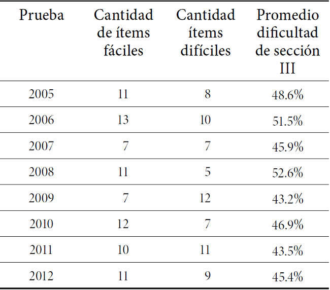 De acuerdo con la Tabla 6, la prueba con mayor cantidad de ítems fáciles es la de 2006 (13) y las que muestran una menor cantidad de fáciles son 2007 y 2009 (7). Considerando la dificultad alta, el 2009 exhibe la mayor cantidad de ítems difíciles (12), seguido del 2011 (11). Cruzando ambos rangos, se aprecia que la prueba del año 2009 resultó la más difícil, lo cual se corrobora al contrastar esta información con la columna siguiente, donde aparece el promedio de dificultad de la sección III de cada prueba: como puede verse, el año 2009 tiene el nivel de dificultad más elevado (43.2 por ciento).