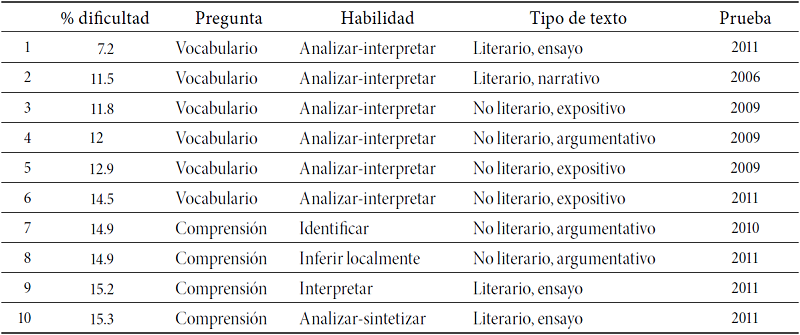 Los seis ítems más difíciles (bajo 15 por ciento de dificultad) son de vocabulario, lo que demuestra que este tipo de preguntas presenta un desafío en la comprensión lectora para los postulantes que rinden la PSU. Otro aspecto relevante es la categoría de texto a la que pertenecen los ítems difíciles, pues se aprecian correlaciones relevantes si contrastamos esta información con la Tabla 4: